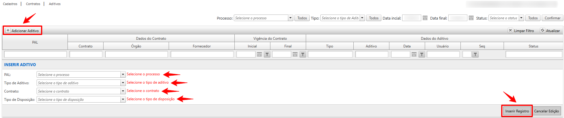 Selecione o "Processo", o "Tipo de Aditivo", o "Contrato" e o "Tipo de Disposição" (Artigos ou Cláusulas). Após, clique em Inserir Registro.