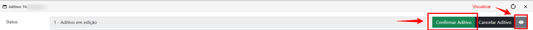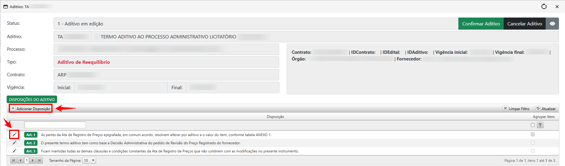 - Uma nova tela irá abrir. É permitido adicionar "Disposição", se desejar. É permitido também editar as Disposições do Aditivo (Artigos ou Cláusulas), clicando na ferramenta lápis.