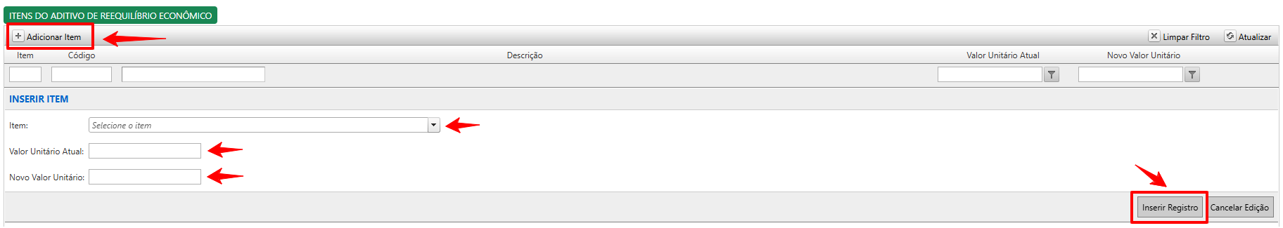 É necessário adicionar itens contendo informações de acordo com a especificidade do Aditivo, ou uma nova vigência final, se for Aditivo de Prazo. Estes registros serão alterados após conclusão de todas as etapas.
