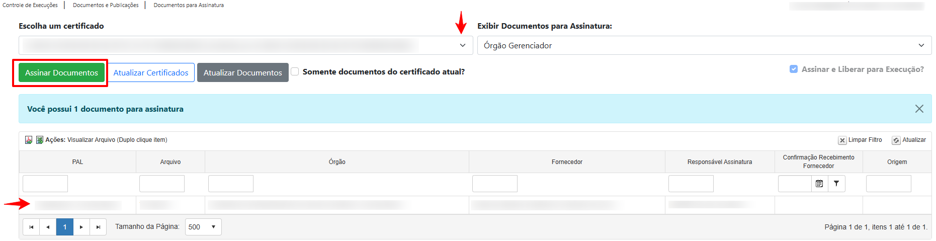 - Para prosseguir, será necessário assinar o documento. Acesse: Controle de Execuções » Documentos e Publicações » Documentos para Assinatura. Selecione o documento, o certificado e clique em Assinar Documentos. São necessárias 4 (quatro) assinaturas: Órgão Gerenciador, Fornecedor e 2 (duas) Testemunhas.
