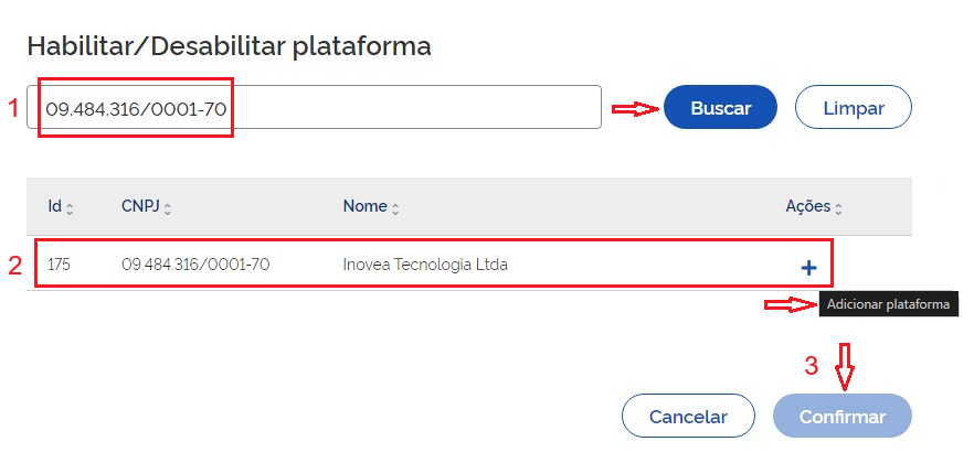 - Faça a seleção da plataforma "Inovea Tecnologia Ltda" e clique no botão "+" para adicionar.