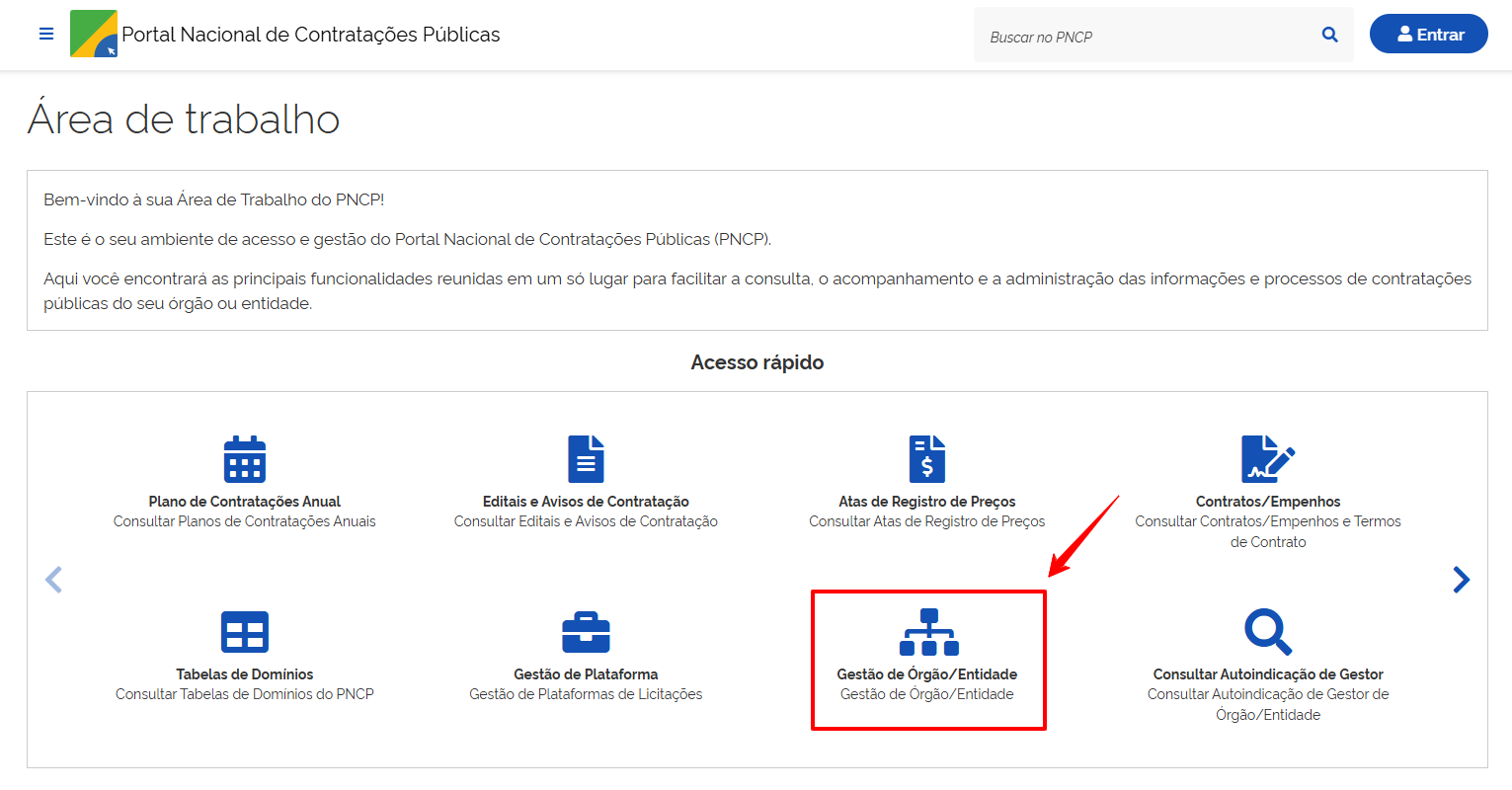 Para incluir a plataforma no PNCP, acesse o site: https://pncp.gov.br/app/area-de-trabalho.