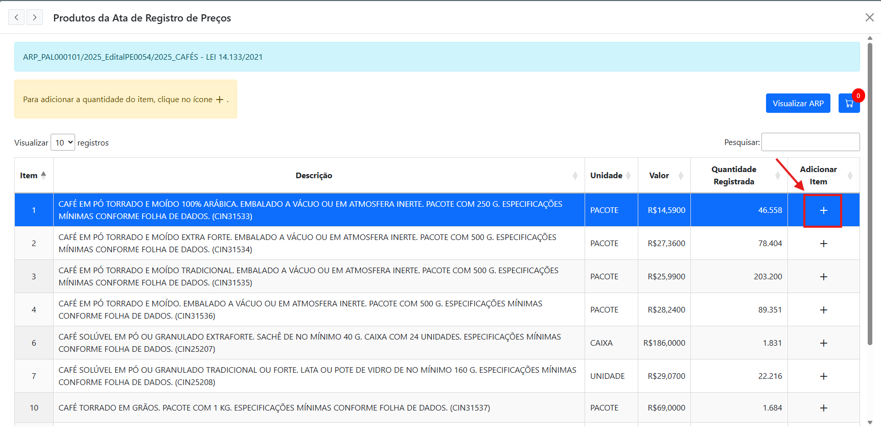 - Uma nova tela irá abrir. Selecione os itens que desejar, clicando no ícone "+" para adicionar a quantidade.