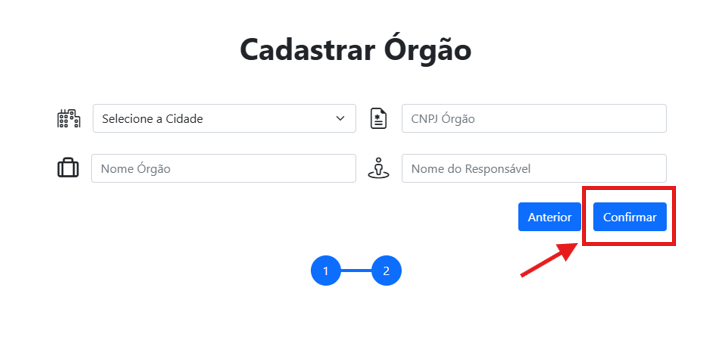 - Para efetuar novo cadastro, preencha as informações solicitadas na tela 1 (Usuário) e na tela 2 (Órgão). Após, clique em "Confirmar".