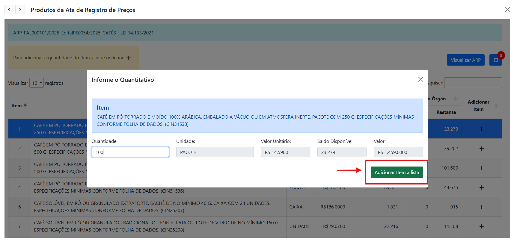 - Ao adicionar o item, informe a quantidade que deseja e clique em "Adicionar Item a lista" e faça a confirmação.