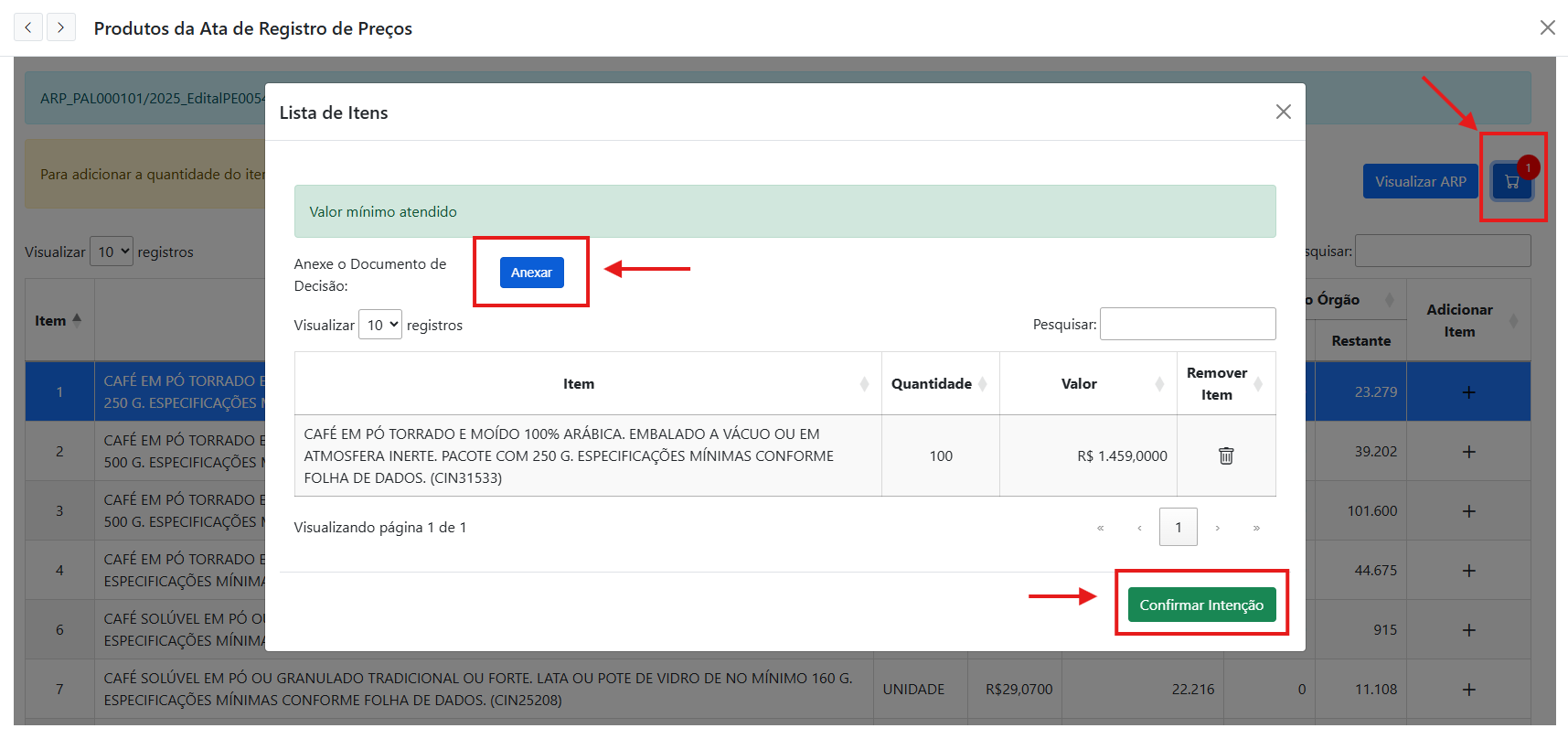 - Quando concluir a adição de itens, clique no ícone de "Carrinho de Compras". Abrirá a Lista de Itens. Anexe o Documento de Decisão e clique em "Confirmar a Intenção".