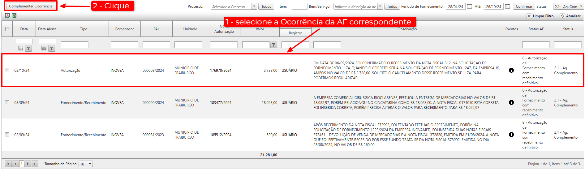 - Para complementar uma Ocorrência que está no status 2.1 - Ag. Complemento, selecione a Ocorrência da AF correspondente e clique em "Complementar Ocorrência" para prosseguir com a adição de informações.