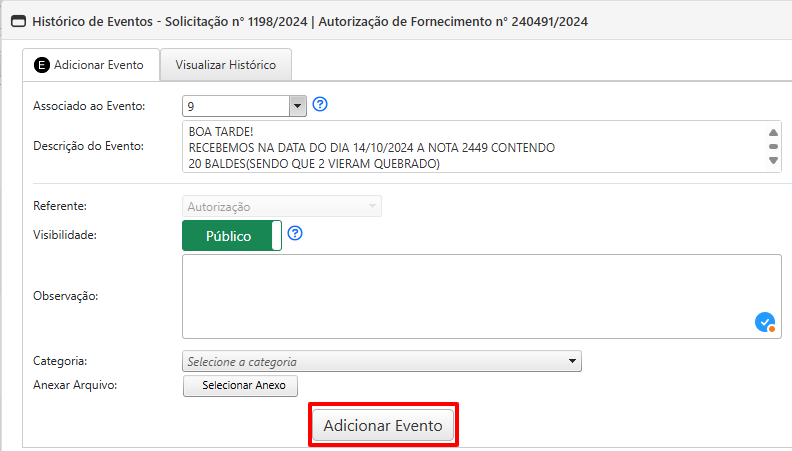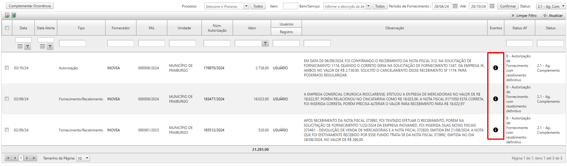 Tela para visualização e gerenciamento de todos os Eventos e Ocorrências vinculados à Solicitação/Autorização de Fornecimento.