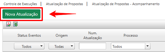 Selecione no menu o item Controle de Execuções » Atualização de Propostas » Atualização de Propostas - Acompanhamento.