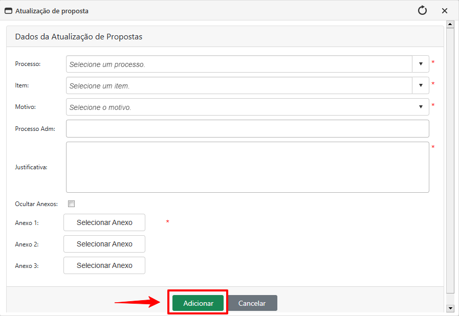 Se o Fornecedor desejar iniciar uma Atualização de Propostas: