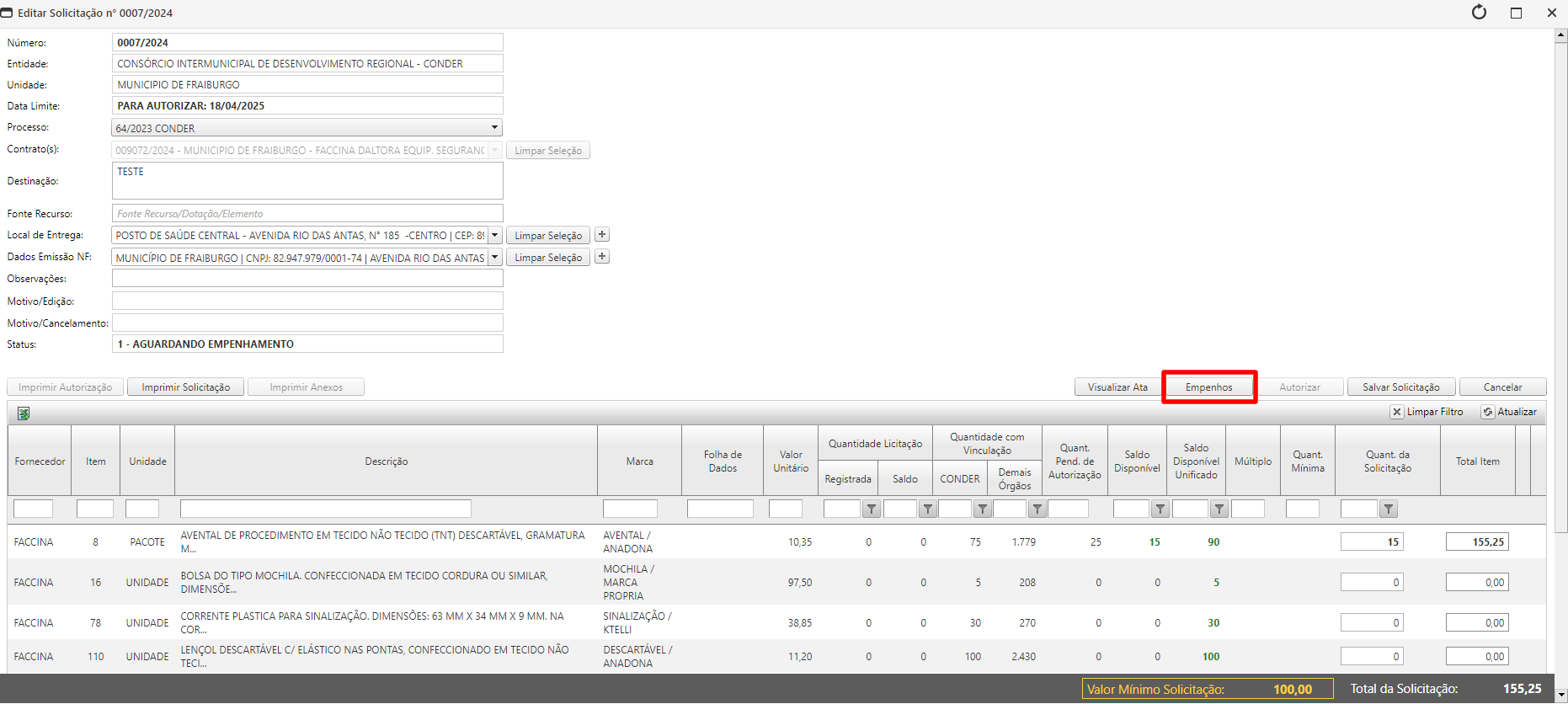 - 2.1 Duplo clique na linha da solicitação, sendo direcionado a tela com os dados da solicitação e os itens solicitados. Ao acessar essa tela, clique na opção "Empenhos".
