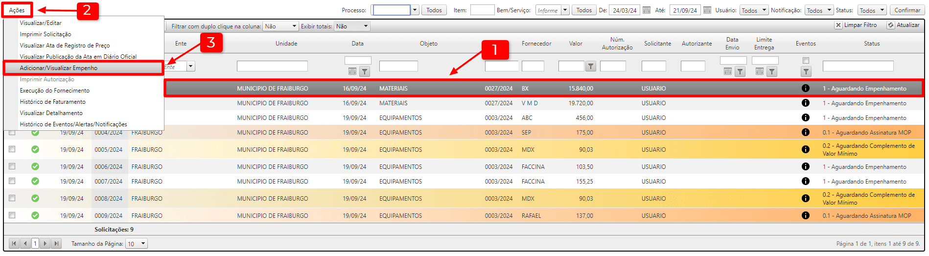 - 1.1 Selecionar a linha correspondente à solicitação que deseja empenhar.