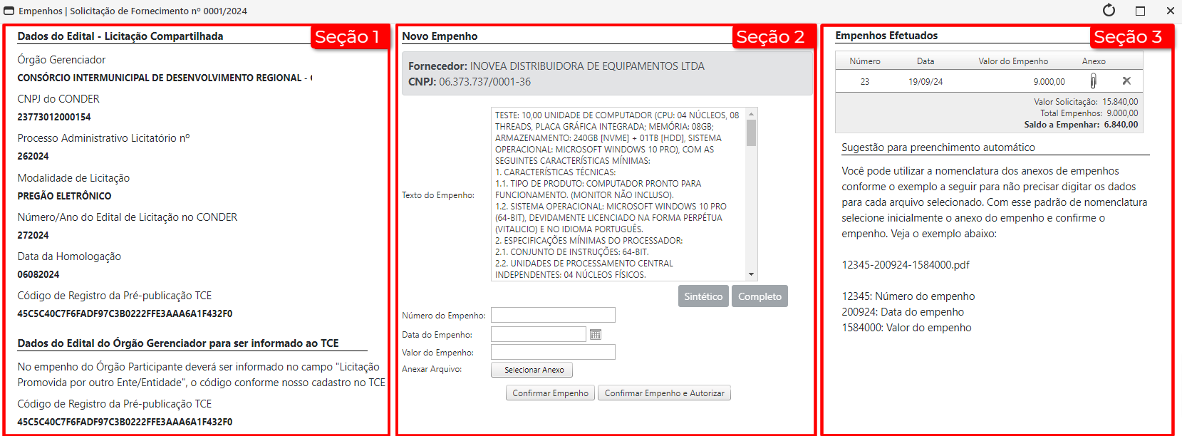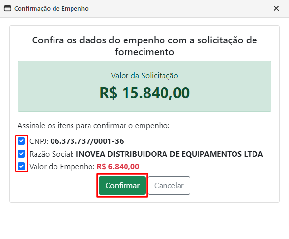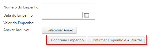 - "Confirmar Empenho": (Solicitante, Autorizante ou Admin Órgão) O status da Solicitação será alterado para Aguardando Autorização.