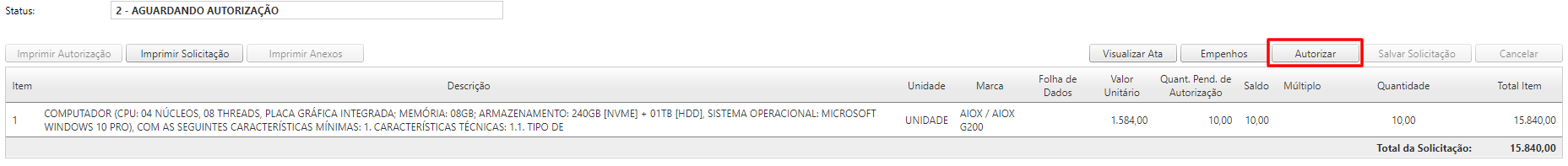 - "Confirmar Empenho e Autorizar": (Autorizante ou Admin Órgão) O status da Solicitação será alterado para Aguardando Recebimento da Autorização