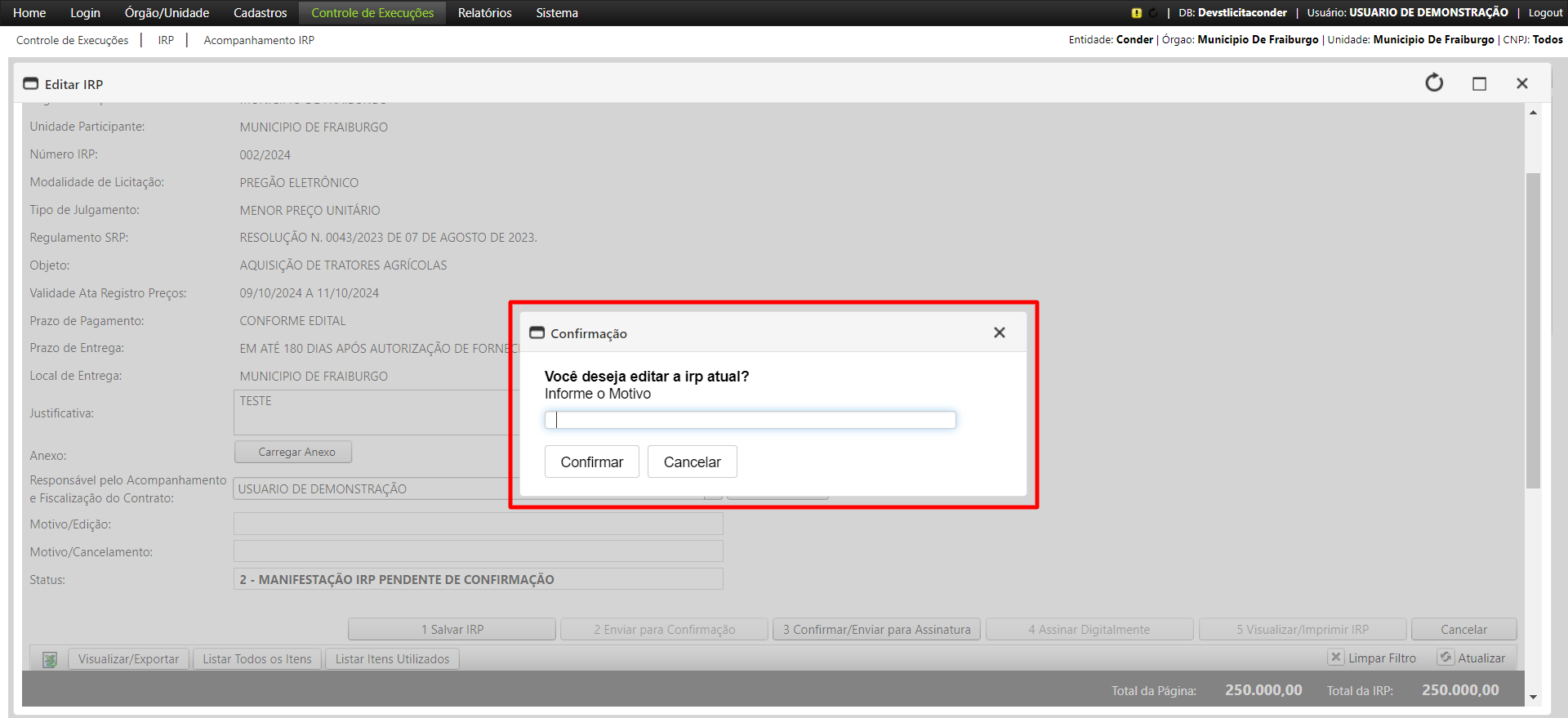 O usuário deve observar o status da IRP para verificar se ainda é possível editar. É importante lembrar de sempre salvar as alterações feitas e preencher o campo de Motivo da Edição para registrar e justificar qualquer alteração realizada, garantindo transparência no processo. Mas se a IRP já tiver sido autorizada e assinada, não será possível realizar novas edições. Nesse caso, recomenda-se criar uma nova IRP com os dados e quantitativos necessários.