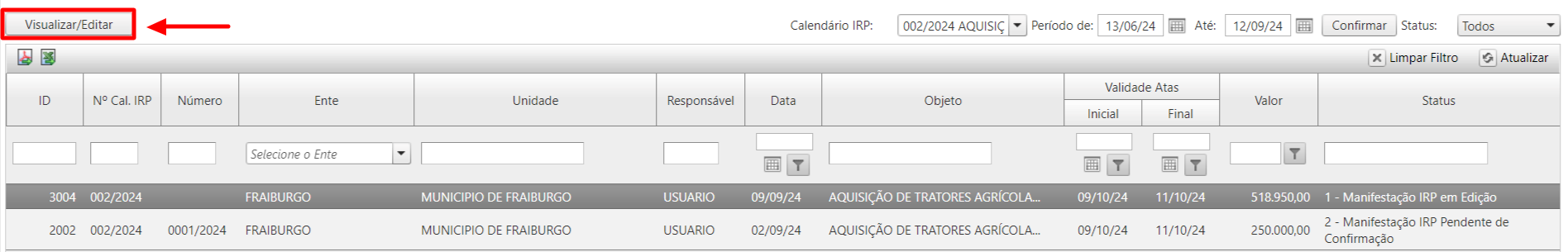 Para consultar detalhes da IRP, realizar alterações ou verificar o progresso, você pode selecionar a IRP desejada e clicar no botão "Visualizar/editar", ou também é possível abrir a IRP com um duplo clique, o que permite que a tela de edição se abra automaticamente. Isso permite um controle contínuo e a verificação das informações já registradas no sistema.