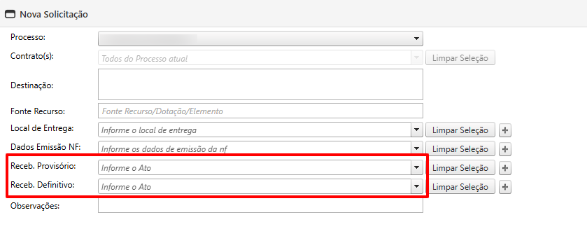 - Ao ativar a opção, os campos "Recebimento Provisório" e "Recebimento Definitivo" serão adicionados na tela de solicitações.