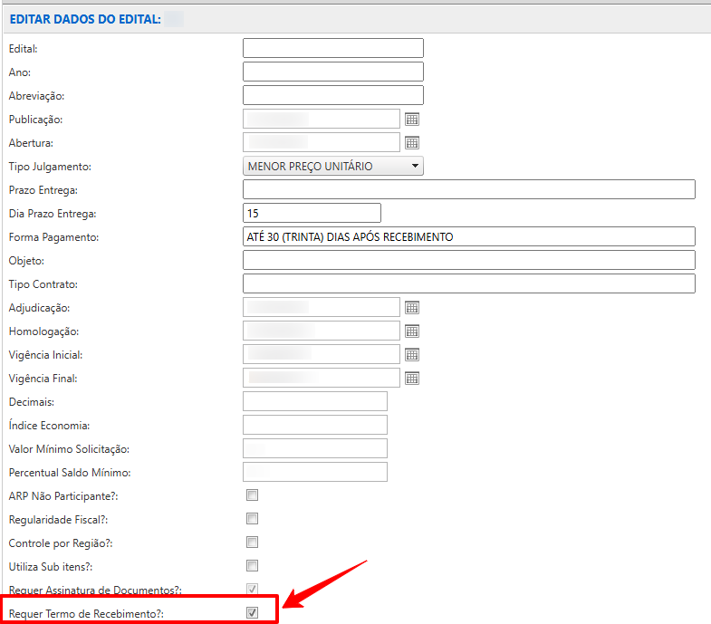 - Para ativar os Atos de Recebimento, o item "Requer Termo de Recebimento" deverá ser assinalado.