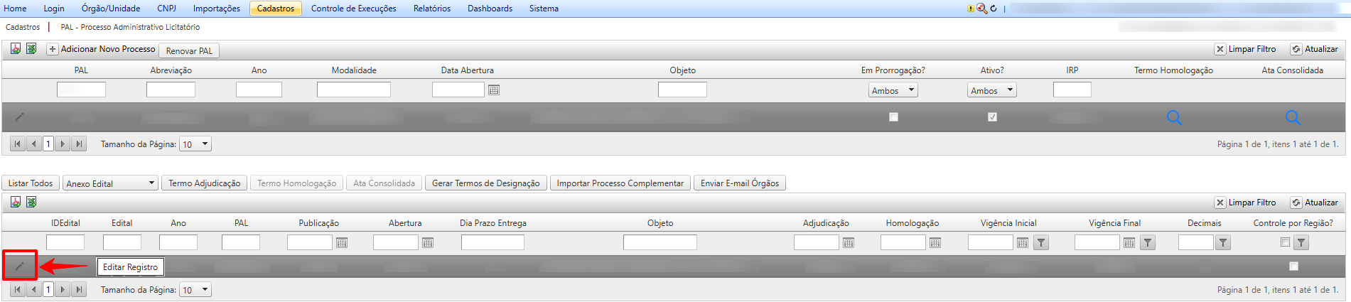 Selecione o Processo e após clique na ferramenta "lápis" do Edital, para editar registro: