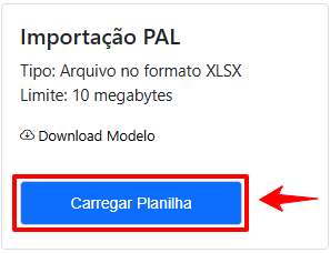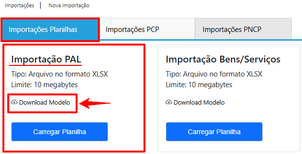 Na Aba "Importações Planilhas" clique em "Download Modelo" em Importação PAL.