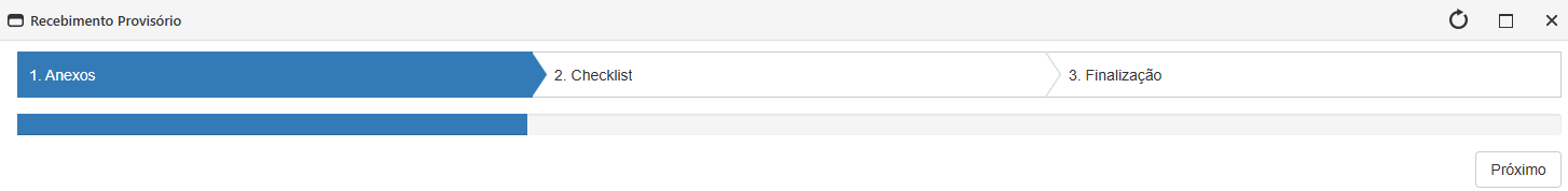 - Os recebimentos Provisório e Definitivo acontecem em 3 etapas: Anexos, Checklist e Finalização.