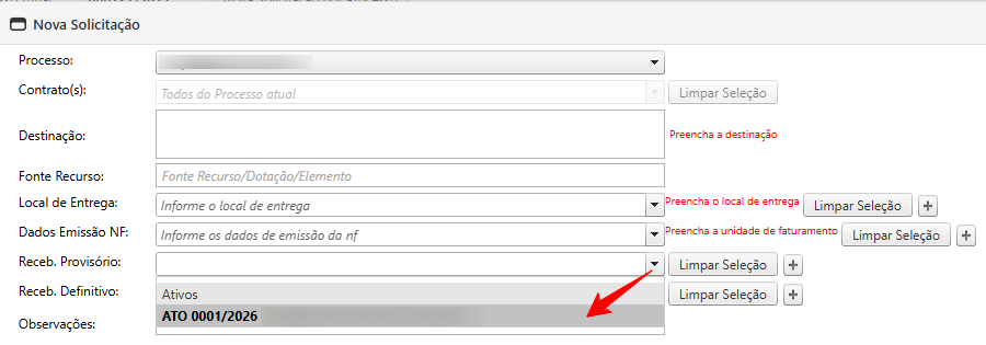 - Ao realizar uma nova solicitação em: Controle de Execuções » Solicitações » Nova Solicitação, será necessário informar os Atos de Recebimento Provisório e Definitivo. Basta clicar na seta e selecionar o(s) ato(s) cadastrado(s).