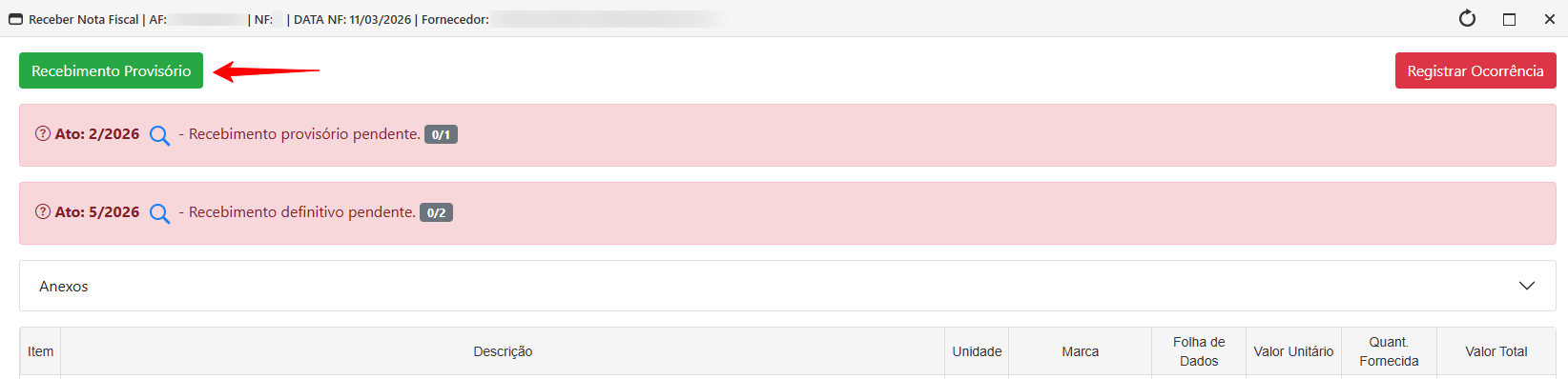 - Após a geração da AF e após realizado seu recebimento e fornecimento por parte do fornecedor, a solicitação avançará para o Status 6 - AF com Execução Total a Comprovar. Neste Status, deverá ser confirmada a entrega dos produtos e realizados os recebimentos provisórios e definitivos. Os Atos poderão ser visualizados nesta tela de recebimento.