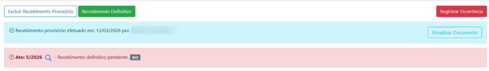 Atenção: Não é permitido incluir o mesmo ato nos recebimento provisório e definitivo, nem o mesmo responsável. Para que os atos possam ser vinculados à uma solicitação, devem estar aprovados e ativos.