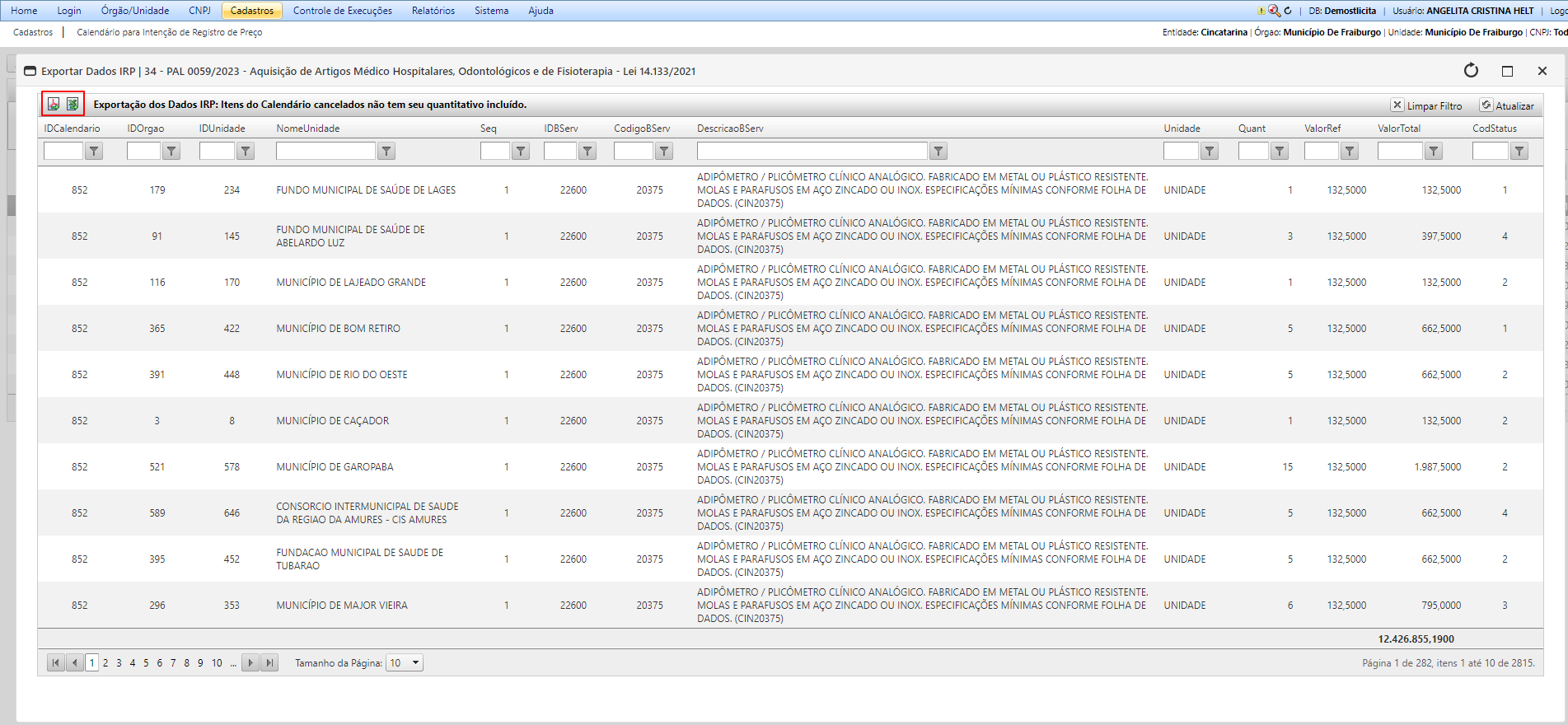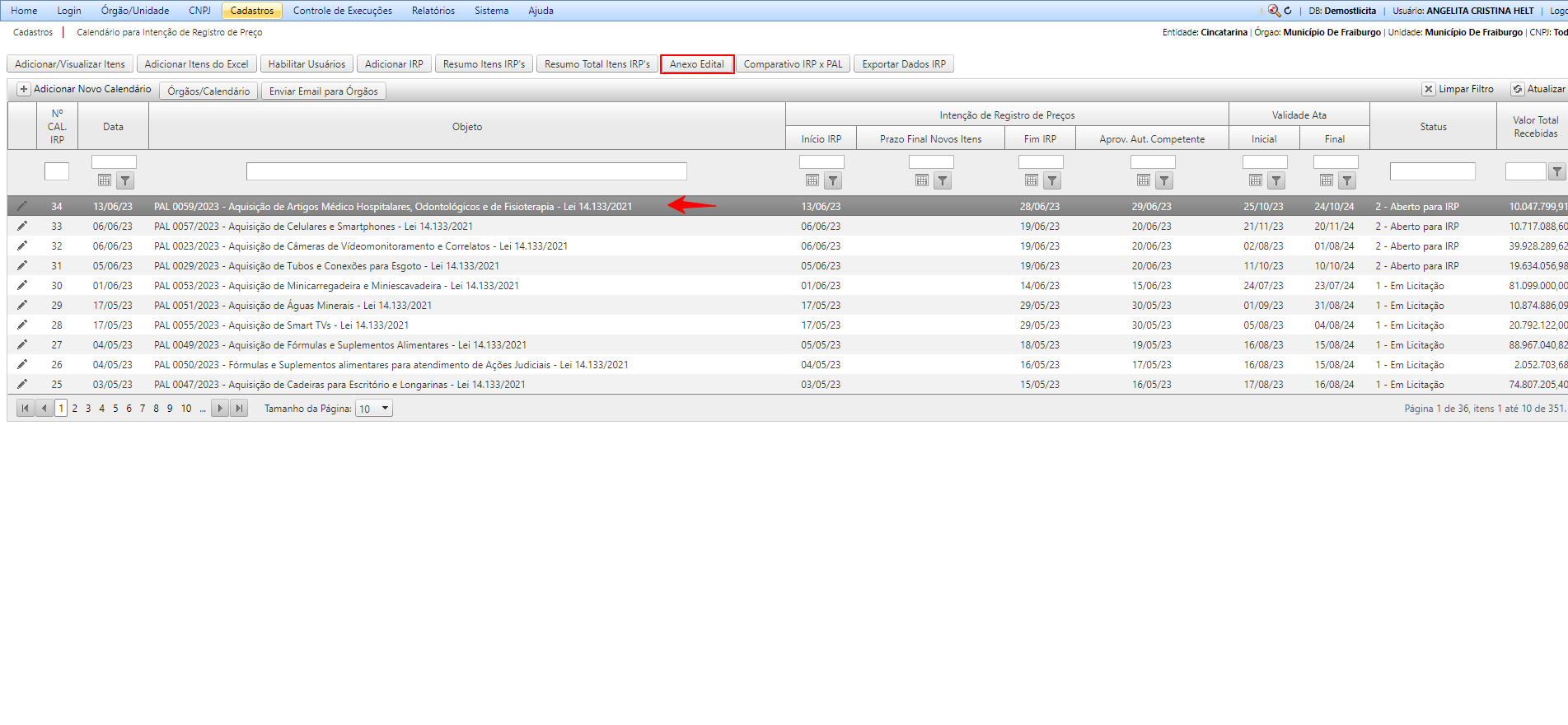 Após finalizado a vigência do Calendário IRP, será necessário gerar o Anexo do Edital. O Anexo do Edital é um arquivo com um resumo dos dados dos itens e dos quantitativos efetuado pelos municípios. Caso se faça necessária uma avaliação ou formatação dos dados informados, você poderá exportar em PDF, XLS ou Word Document para manipular os dados conforme a necessidade. Este anexo é um complemento do Edital e deve ser anexado à documentação do mesmo.