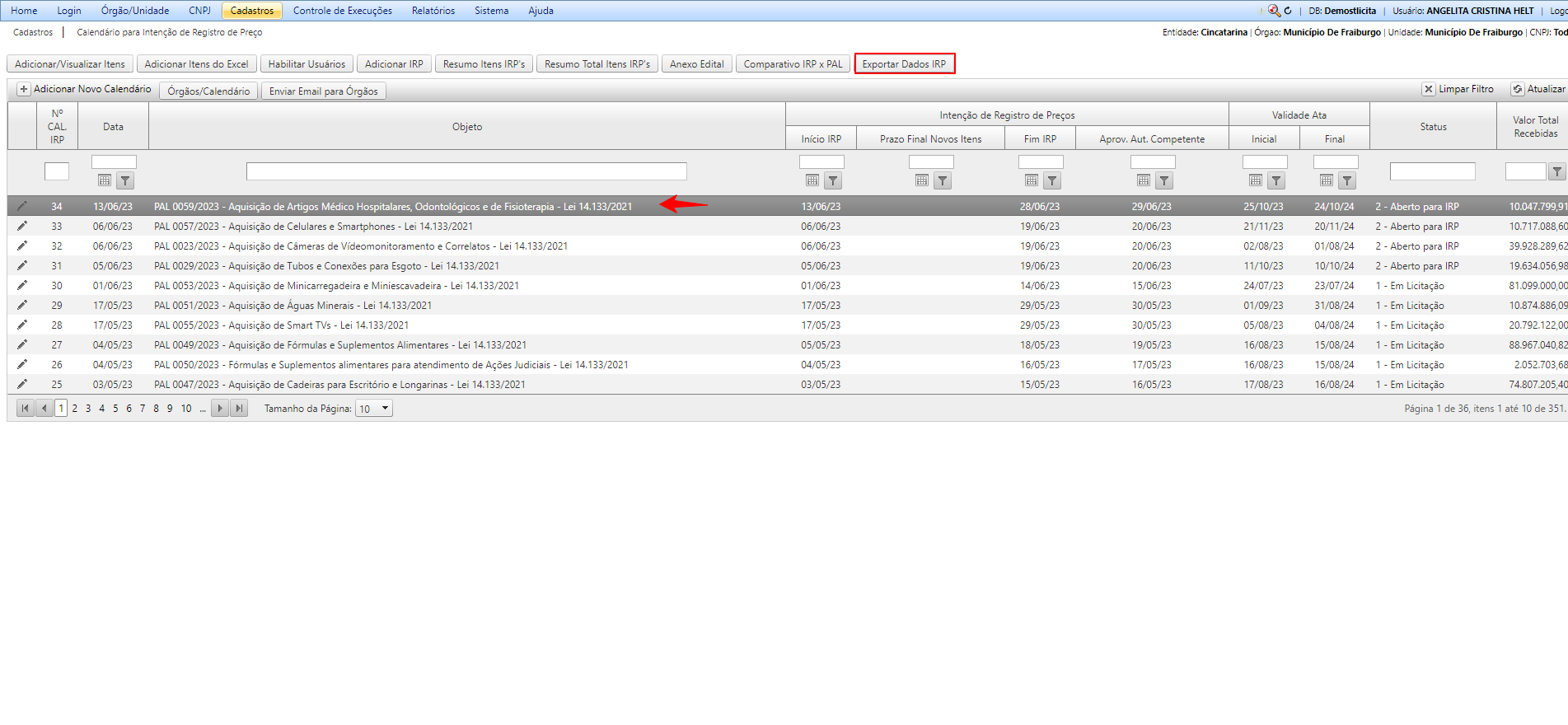 Selecione no menu o item » Cadastros e depois » Calendário para Intenção de Registro de Preços.