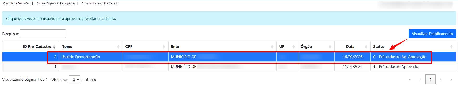 Selecione com "Duplo Clique" o pré-cadastro com "Status 0 - Pré-cadastro Ag. Aprovação" para visualizar o detalhamento.