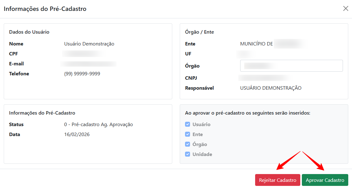 - Abrirá a tela com Informações do Pré-Cadastro do Usuário e Órgão para visualização. As ações possíveis são: Rejeitar ou Aprovar.