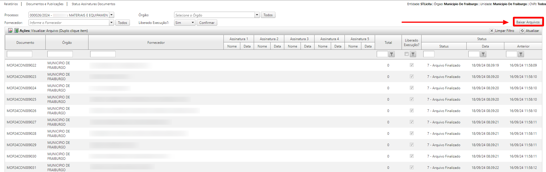 Ao clicar em Baixar Arquivos o sistema irá gerar um arquivo compactado (ZIP) contendo todos os documentos assinados relacionados ao processo.