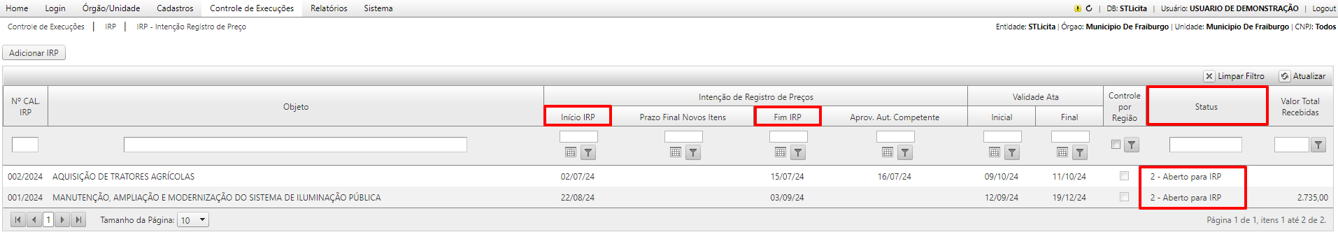 - Os Calendários IRP's com o status 2 – Aberto para IRP indicam que estão dentro do prazo para inclusão de quantidades. Essa etapa fica aberta para registro por um período determinado e, após a data final, não será possível reabrir para novos registros.