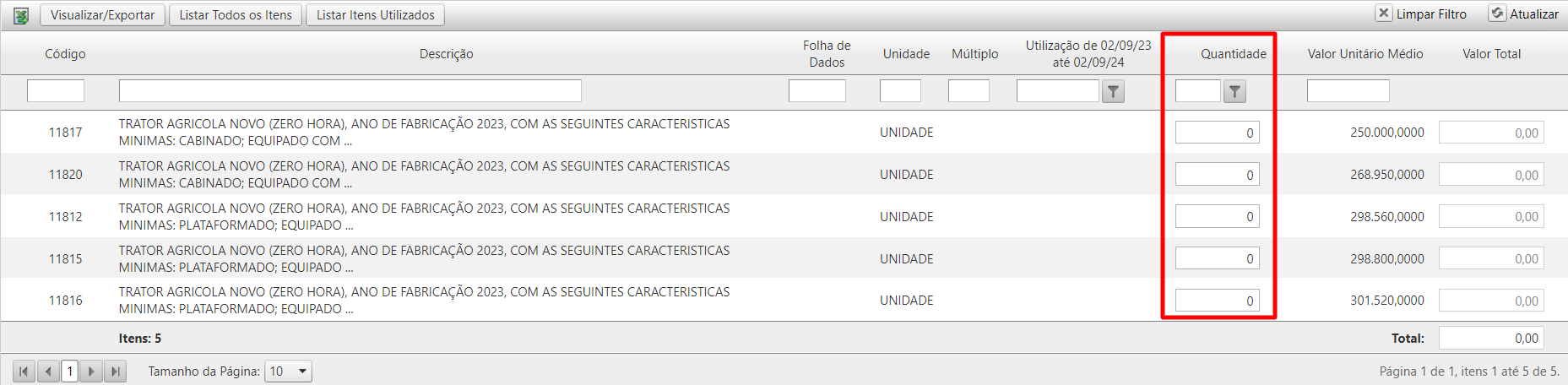 - Na tabela de exibição dos itens, o usuário deve especificar a Quantidade de cada item, conforme as necessidades do seu Órgão/Unidade.