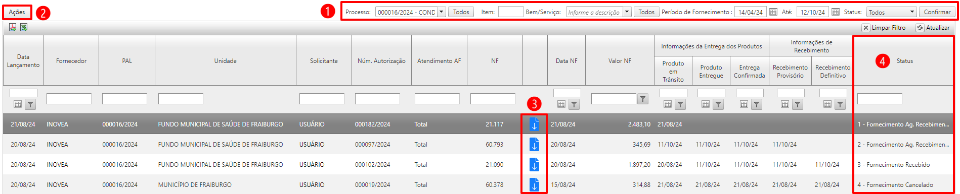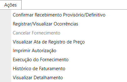 Você pode selecionar o Fornecimento e clicar no botão "Ações" ou com duplo clique para abrir a telha de detalhamento.