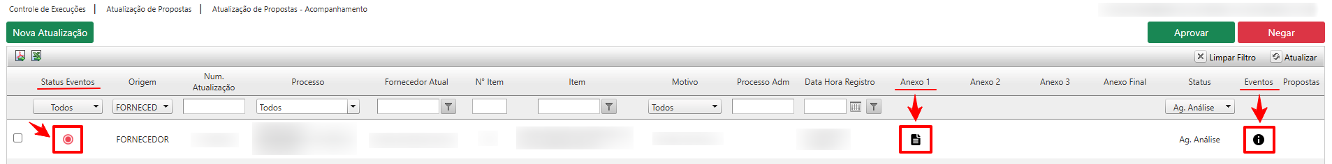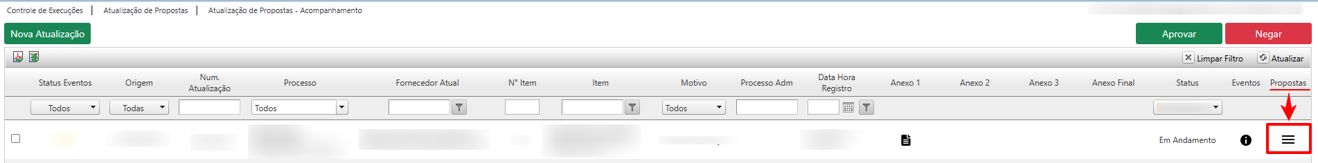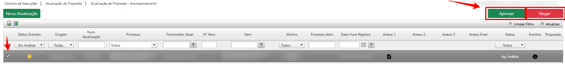 Após feita a "Nova Atualização de Proposta" você deverá selecionar o registro e clicar em "Aprovar" ou "Negar".