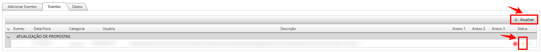 - Na Aba "Eventos", o Status poderá ser alterado para "Em Análise", se desejar. Após clique no ícone "Atualizar".