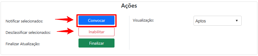 - Você deverá fazer a seleção do(s) Fornecedor(s) e clicar em "Convocar" ou "Inabilitar", se desejar.