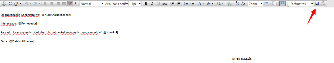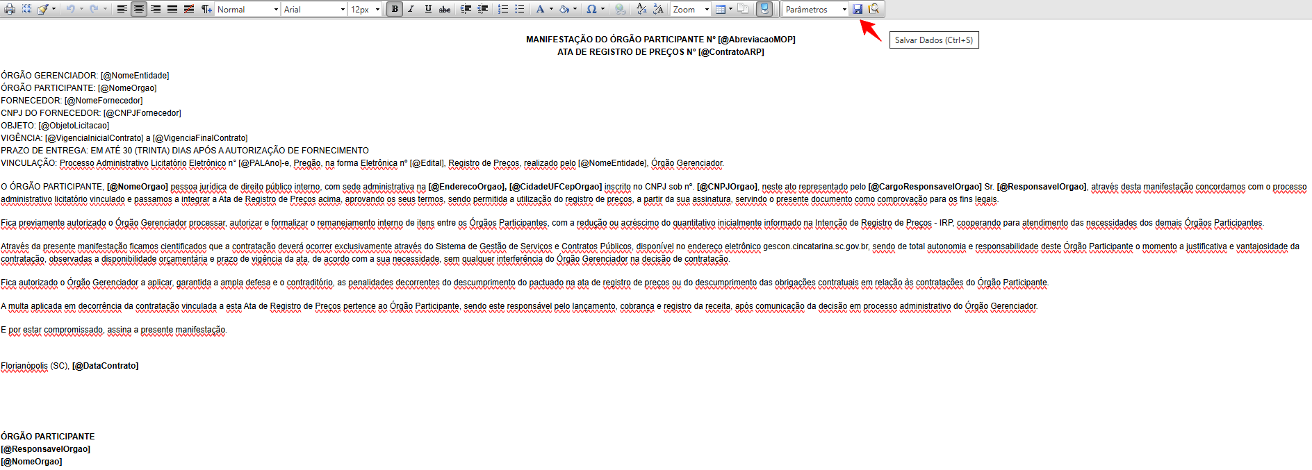 Os modelos devem ser editados de modo a atender as necessidade específicas. Possuem partes textuais, que são fixas, e parâmetros, identificados entre colchetes ex: [@AbreviacaoContrato] que são substituíveis automaticamente pelo sistema, portanto, não podem ser alterados.