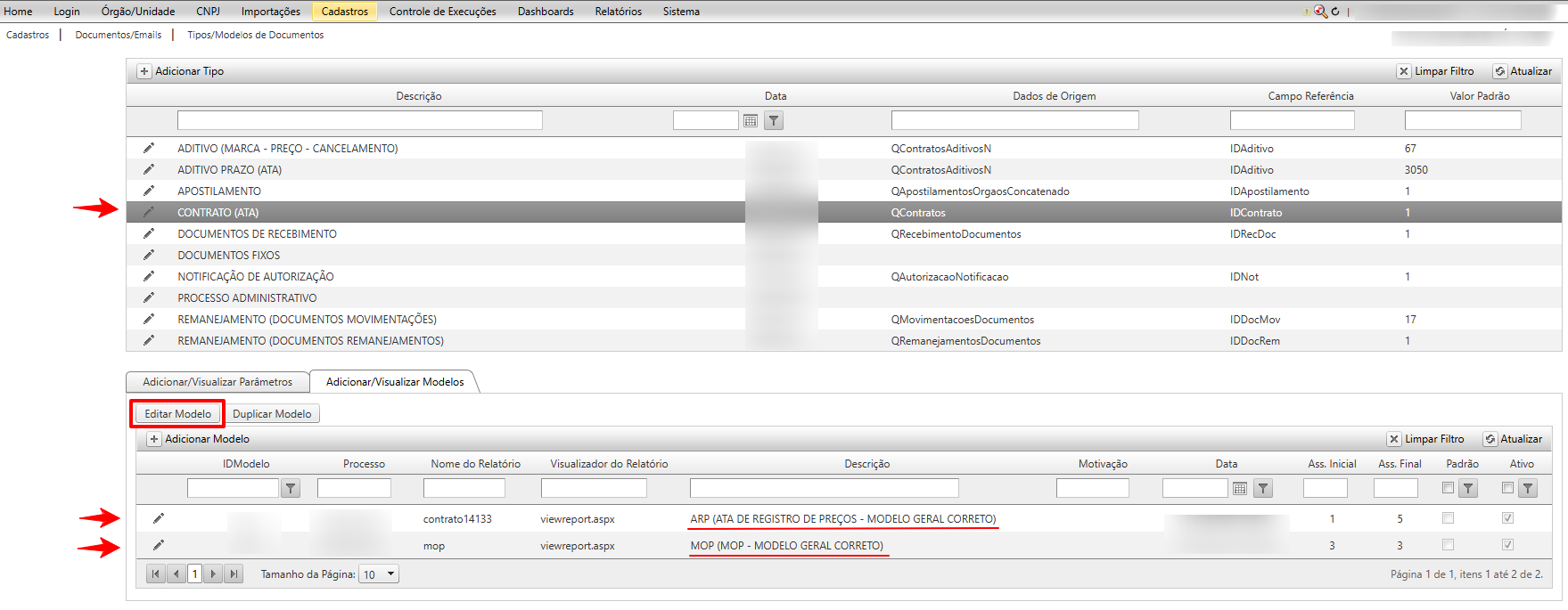 Você deverá selecionar "CONTRATO (ATA)" e após ARP e MOP para edição. Selecionar um por vez e clicar em: Editar Modelo.