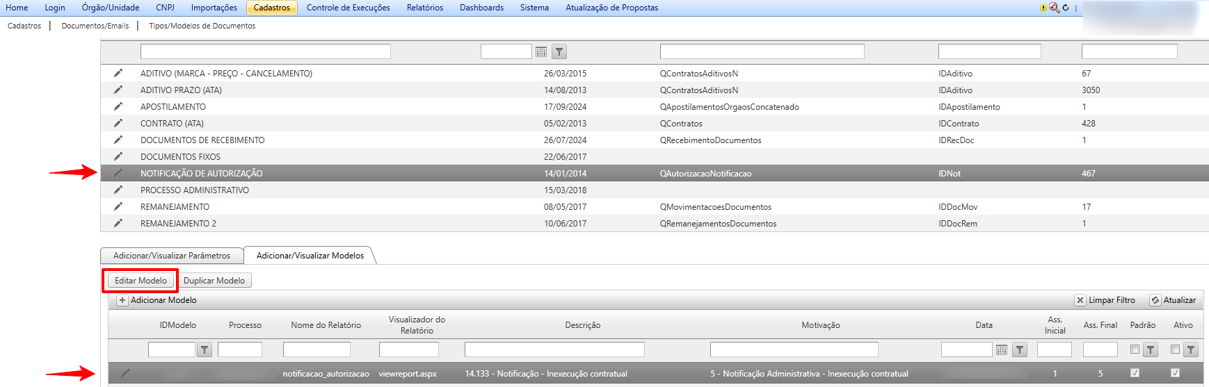 Você deverá selecionar "NOTIFICAÇÃO DE AUTORIZAÇÃO" e após o modelo de notificação que desejar. Clique em: Editar Modelo.