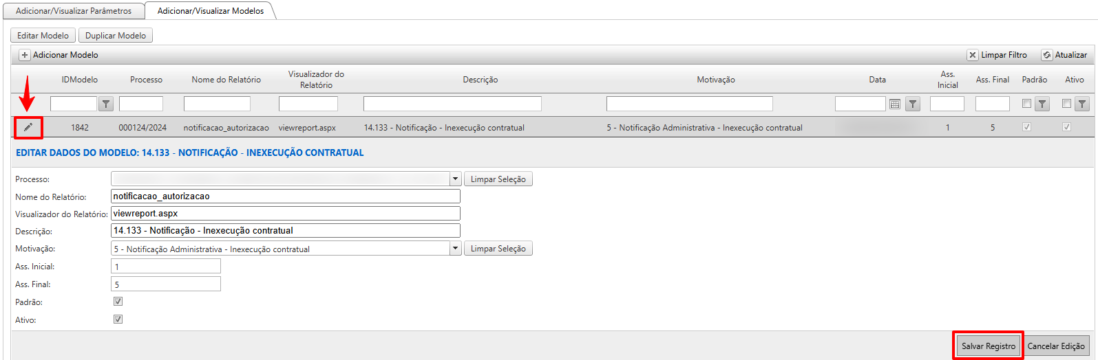 - Os modelos de Notificação também devem ser vinculados ao Processo Licitatório, clicando na ferramenta lápis > Editar registro. Após preencher as informações, clicar em Salvar Registro.
