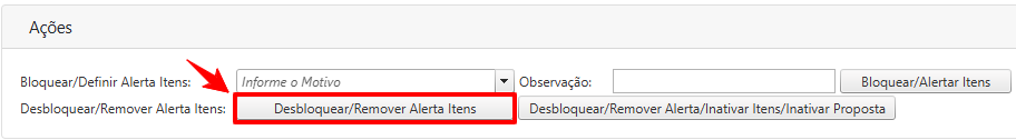 Para desbloquear ou remover o alerta dos itens, basta clicar no botão: Desbloquear/Remover Alerta Itens.