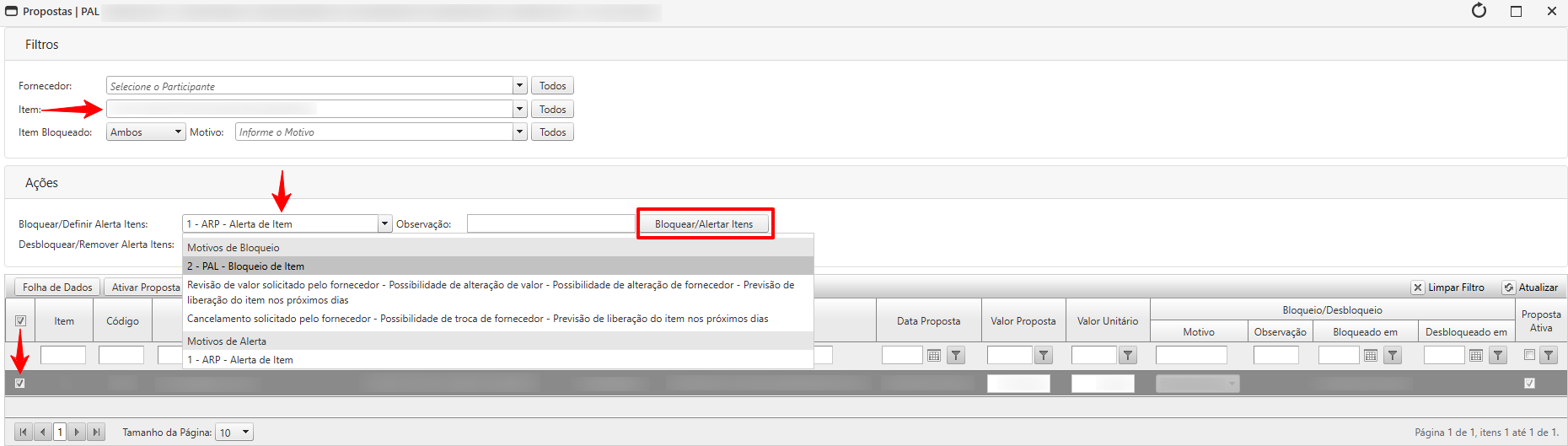 - Uma nova tela irá abrir. Em "Filtros", selecione o Item que deseja bloquear/alertar (ou use outros filtros, se necessário). Em seguida, marque a caixa do Item para selecionar. Em "Ações", selecione o motivo do bloqueio ou alerta, escreva uma observação (se necessário) e clique no botão Bloquear/Alertar Item.