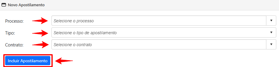Selecione o "Processo", o "Tipo de Apostilamento" e o "Contrato" e clique em Incluir Apostilamento.
