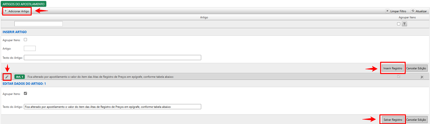 - A tela irá atualizar e você poderá adicionar um novo Artigo, clicando na ferramenta "+", preencher as informações solicitadas e clicar em Inserir Registro. Se desejar fazer a edição de um artigo existente, basta clicar na ferramenta "Lápis", alterar as informações e clicar em Salvar Registro.