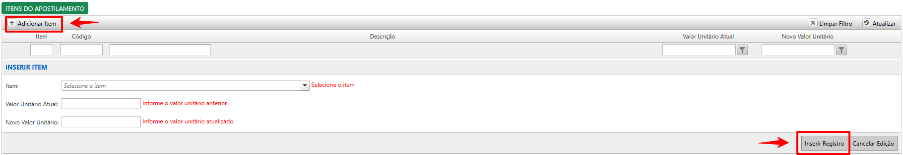 Se o tipo de Apostilamento for "Troca de Marca", uma "Nova Marca" deverá ser informada. Caso for por "Reequilíbrio Econômico", um "Novo Valor Unitário" deverá ser informado.