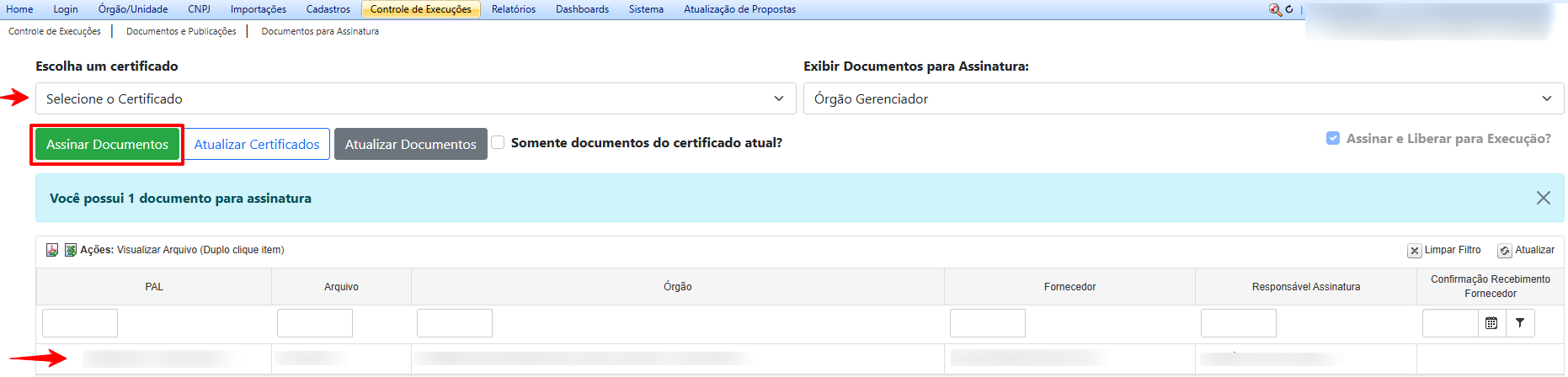 Selecione o Documento, o Certificado e clique em Assinar Documentos.