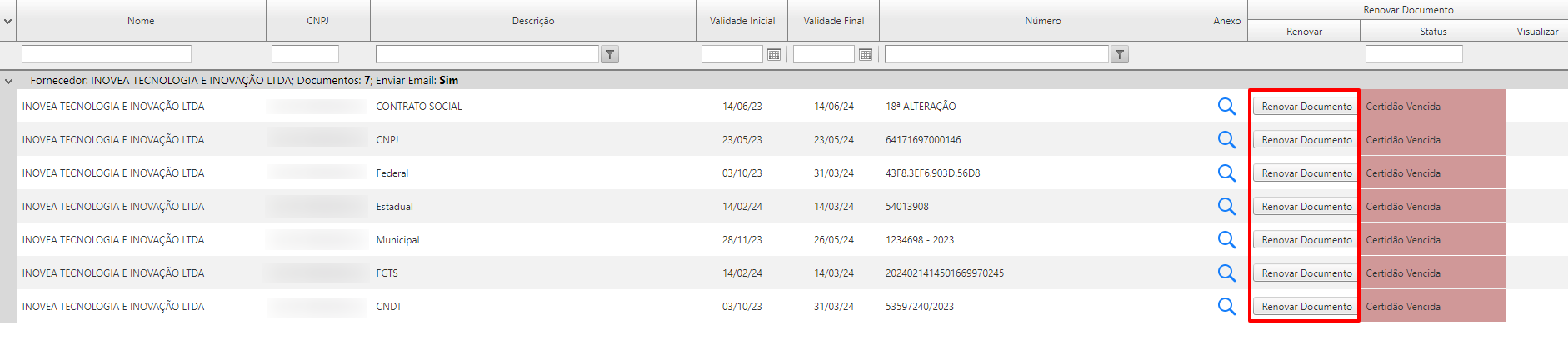 Para atualizar os documentos da Habilitação Jurídica, o fornecedor deve clicar em "Renovar Documento".